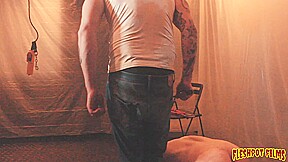 Hunk Scott tries feet tickling for the first time. He was very happy with it. They bound him and used an electric toothbrush for his bare feet.